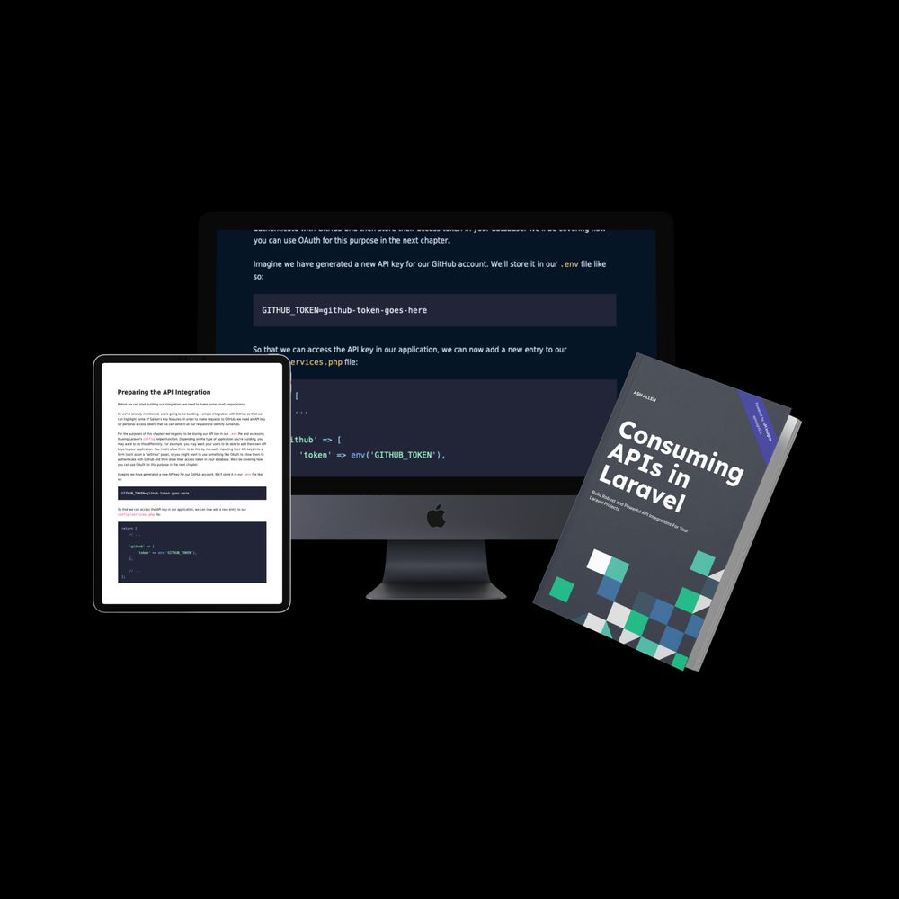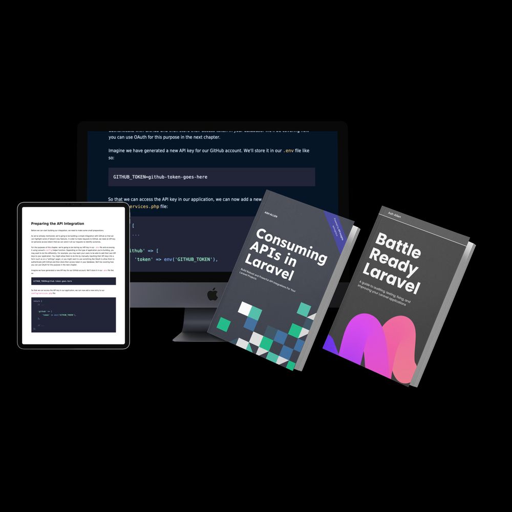 Get instant access to both ebooks in this bundle! Battle Ready Laravel: A guide to auditing, testing, fixing, and improving your Laravel applications. Consuming APIs in Laravel: Learn how to confidently integrate third-party APIs in your Laravel projects using maintainable, testable and extensible code.